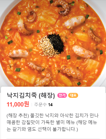 本粥 泡菜章魚粥(낙지김치죽)(KRW11000)